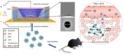 外泌体是从活细胞中分泌的纳米级囊泡,能够在细胞间传递蛋白质、mRNA、miRNA等遗传信息。基于外泌体天然的结构和功能特征,其具有天然的靶向性,同时又不会引起促炎反应和免疫反应,因此成为药物递送的理想选择。但是从细胞中分离的外泌体产量少、mRNA的装载效率低以及递送效率差仍然是现阶段研究中亟待解决的问题【1,2】。本文成功开发了一种细胞纳米穿孔技术(Cellular nanoporation,CNP),使用光刻蚀和深反应离子刻蚀相结合的工艺,制成了含纳米孔道的生物芯片,加载瞬时电脉冲后,质粒从缓冲液穿梭到附着在生物芯片的细胞中,以刺激细胞产生和释放外泌体,同时增加内源性mRNA的转录;以此为基础对外泌体进行载药及修饰,修饰后的外泌体在小鼠脑胶质瘤体内、外治疗中均取得较好效果。(图2)。