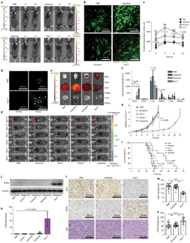 在此基础上,团队对外泌体进行功能化修饰,通过在外泌体表面表达的跨膜蛋白CD47的N端(膜外侧)克隆靶向神经胶质瘤的肽(FKESWREARGTRIERG和CREKA)来提高外泌体在U87和GL261胶质瘤细胞的靶向性。基于CNP技术将PTEN和CDX(克隆靶向肽的CD47)两种质粒转入胶质瘤细胞后得到大量具有靶向性的功能性外泌体(Exo-T),在体外具有增强的细胞摄取以及上调了PTEN蛋白的表达。Exo-T在U87胶质瘤免疫缺陷小鼠模型和具有免疫能力的GL261胶质瘤模型中都具有很好的治疗效果(图4)。