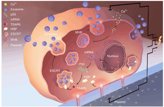 实验结果显示,与传统的电转法相比,CNP产生的外泌体数量多出50倍以上,外泌体中mRNA转录效率增加了1000倍,在提高产量的同时大大简化了功能性外泌体的产生过程。进一步的研究表明,外泌体产量及转录效率提高的细胞机制比较独特,是通过CNP技术造成的局灶性细胞膜损伤和局部加热导致HSPs上调和细胞内Ca2+升高【3,4】,进而激活了P53-TSAP6途径【5-8】,导致大量细胞内囊泡的形成,促进外泌体产生和分泌(图3)。