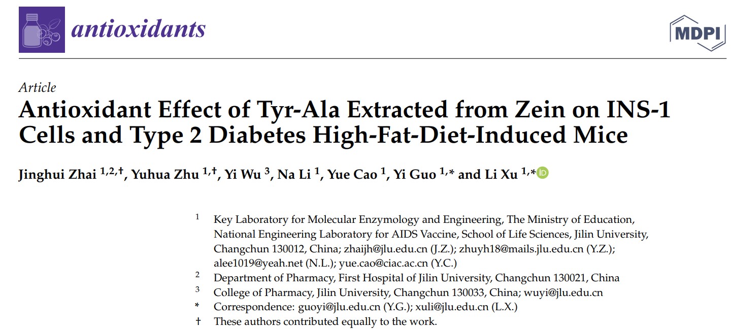 2022年6月2日,bv伟德国际1946官网徐力教授团队在《Antioxidants》发表小分子生物活性肽调节胰岛素分泌研究成果(Antioxidant Effect of Tyr-Ala Extracted from Zein on INS-1 Cells and Type 2 Diabetes High-Fat-Diet-Induced Mice, Antioxidants 2022, 11(6), 1111)。