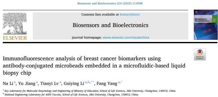bv伟德国际1946官网分子酶学工程教育部重点实验室李桂英教授、杨方副教授团队在微流控液体活检领域取得重要进展,相关研究内容已于近日以题为 Immunofluorescence analysis of breast cancer biomarkers using antibody-conjugated microbeads embedded in a microfluidic-based liquid biopsy chip 在线发表于Biosensors & Bioelectronics, 2022, 216: 114598。