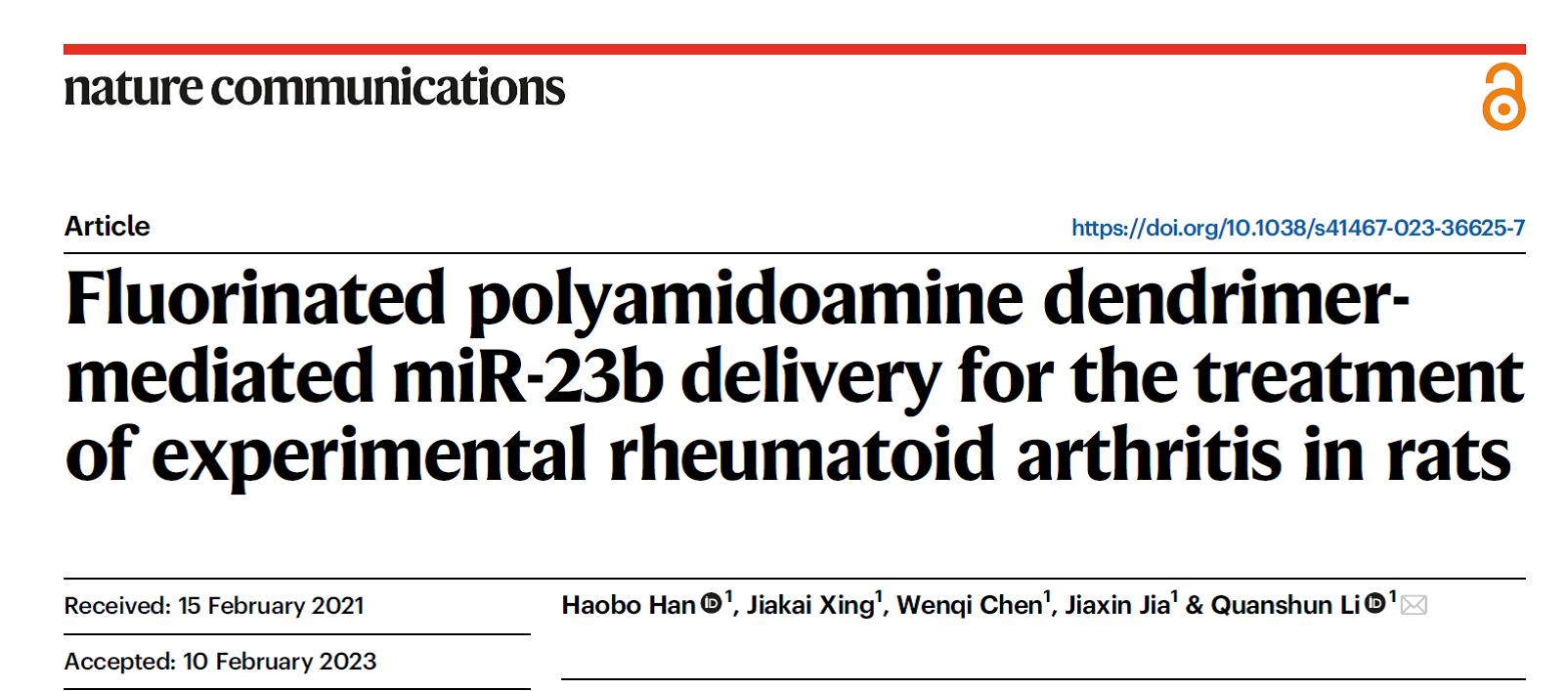 bv伟德国际1946官网分子酶学工程教育部重点实验室李全顺教授团队,针对类风湿性关节炎的关键信号分子miR-23b,构建氟化修饰型树枝状高分子作为基因递送载体,实现miR-23b在关节炎动物模型中的稳定递送,取得了良好的治疗效果;同时,研究揭示了miR-23b能够抑制TAB2、TAB3以及IKK-α表达,阻断NF-κB炎症信号通路,并诱导巨噬细胞凋亡,实现体内抗炎功能。研究结果以Fluorinated polyamidoamine dendrimer-mediated miR-23b delivery for the treatment of experimental rheumatoid arthritis in rats为题,于2023年2月20日在学术期刊《Nature Communications》正式发表。论文第一完成单位为bv伟德国际1946官网,bv伟德国际1946官网韩浩博博士(鼎新学者)为该论文的第一作者,bv伟德国际1946官网李全顺教授为该论文的通讯作者。