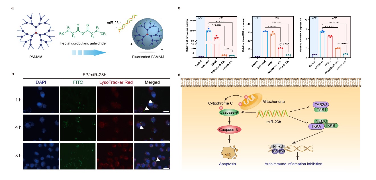 类风湿性关节炎是一种自身免疫介导的慢性炎症疾病,以进行性关节滑膜炎症及骨侵蚀为主要病理特征。在调控滑膜巨噬细胞的炎症信号网络中,寡核苷酸分子miR-23b具有显著的抗炎效果,因此有潜力成为新的药物开发靶点。为提高小核酸miR-23b的稳定性及治疗效果,本研究以树枝状高分子聚酰胺-胺为母体,通过氟化修饰手段,构建了聚酰胺-胺高分子衍生物FP为基因递送载体。FP与miR-23b通过静电组装,形成稳定的纳米复合物,胞内递送后通过靶向TAB2/3及IKK-α基因,抑制NF-κB信号通路激活,降低胞内炎症因子释放,诱导细胞凋亡,实现抗炎生物学功能(图1)。