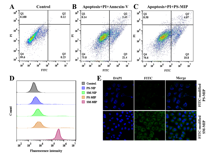 bv伟德国际1946官网胡良海教授和南京大学刘震教授、东南大学陶纬国教授团队合作开发了一种基于磷脂分子印迹的细胞膜识别新策略(图1),可通过对质膜外层暴露的磷脂表位实现对生物膜的选择性识别。将所制备的磷脂酰丝氨酸印迹材料用于对凋亡细胞进行识别和示踪,流式细胞仪和激光共聚焦显微镜分析显示,该材料具有和Annexin-V相近的标记效率(图2),表明脂质靶向的印迹材料具有高度的配体-受体选择识别性能,为细胞成像与靶向药物递送提供了新的手段。