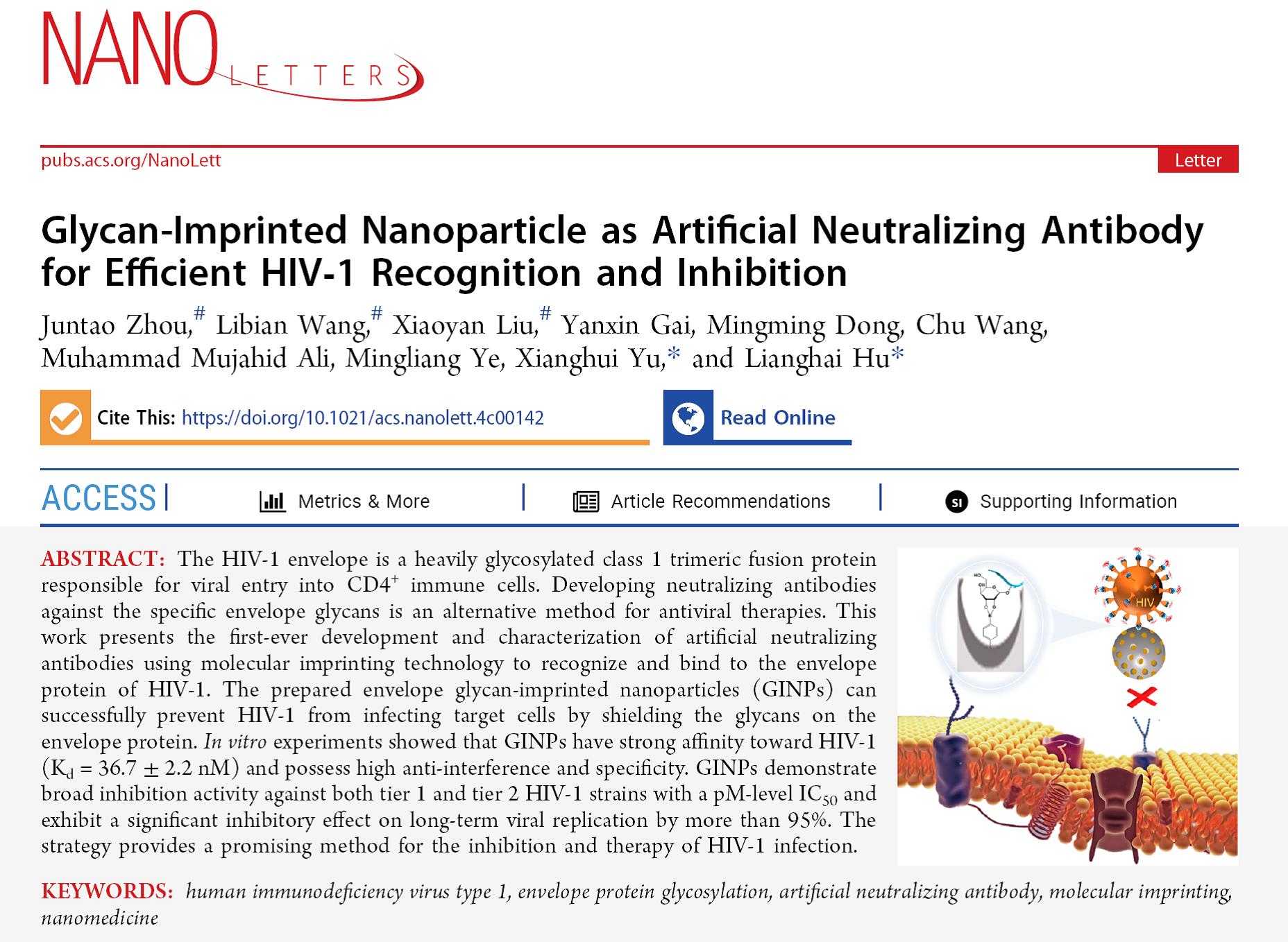HIV-1是导致获得性免疫缺陷综合征(AIDS)的主要病原体,其可利用宿主细胞糖基化等途径来加工病毒包膜蛋白(Env),Env表面的糖链能够遮蔽抗原表位,保护蛋白质免受免疫监视,被称之为“糖盾”。研究发现Env的糖基化修饰有着高度保守的结构,被视为抑制 HIV-1 感染的重要突破口之一,但由于免疫原性较弱,针对病毒糖链的抗体难以获得,且现有靶向Env糖链的中和抗体存在半衰期短和易于引发逃逸突变等缺点。分子印迹(Molecular Imprinting)技术通过模板分子空间结构和结合位点来模拟抗原-抗体之间的相互作用,从而精确识别目标分子。分子印迹材料有着卓越的分子识别性能和稳定性,被称之为人工抗体,已被广泛应用于色谱分离、生物传感、药物递送和仿生催化等诸多领域。基于此,bv伟德国际1946于湘晖教授/胡良海教授团队和中科院大连化物所叶明亮研究员团队合作,开发了针对 HIV-1表面蛋白"糖盾"的分子印迹人工抗体材料,从而有效抑制病毒对细胞的感染,相关研究内容以“Glycan Imprinted Nanoparticle as Artificial Neutralizing Antibody for Efficient HIV-1 Recognition and Inhibition”为题在Nano Letters在线发表。