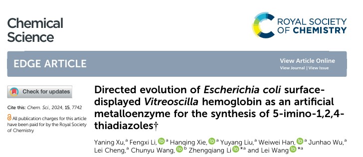 bv伟德国际1946分子酶学工程教育部重点实验室的王磊教授课题组致力于研究利用人工酶催化实现绿色高效有机合成,以《Directed evolution of Escherichia coli surface-displayed Vitreoscilla hemoglobin as an artificial metalloenzyme for the synthesis of 5-imino-1,2,4-thiadiazoles》为题在国际期刊Chemical Science发表研究论文。该研究团队通过将钴卟啉辅因子替代原有的血红素辅因子并与大肠杆菌膜蛋白串联表达,后经过两轮组合活性位点饱和突变/迭代饱和突变(CAST/ISM)策略的定向进化成功构建了一种具有六个位点突变的新型人工VHb硫脲氧化酶(ATOase)的全细胞催化剂,并将其应用于5-亚氨基-1,2,4-噻二唑的合成。其催化活性显著提高,具有广泛的底物适用性。文章中利用全细胞催化体系可简化人工金属酶的构建与筛选过程,同时该方法可以较大程度保持酶的活性以提高酶的催化速率。这项研究不仅展示了VHb作为人工金属酶在新反应中的潜力,该文章中构建人工金属酶全细胞催化剂的研究思路还为其他新型人工酶的开发提供了新的策略,对于推动酶促绿色有机合成领域的发展具有重要意义。论文第一完成单位为bv伟德国际1946官网,bv伟德国际1946官网博士研究生许雅宁为该论文的第一作者,bv伟德国际1946王磊、李正强教授为该论文的共同通讯作者。