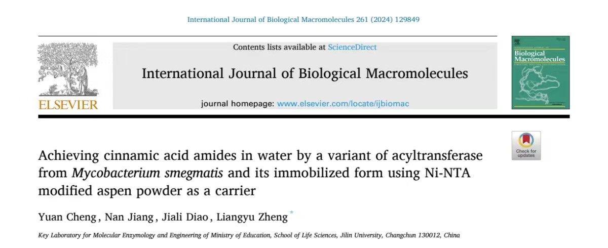 通过虚拟筛选获得的酰基转移酶 MsAcT突变体,具有水相N-酰化反应活性,可以在水相中实现肉桂酸酰胺的高产率制备;以生物质木粉为载体,采用亲和固定化策略,实现了MsAcT突变体的同步纯化与固定化,进一步提高了酶在水相中的N-酰化反应活性,使用稳定性及重复实用性,具有很好的应用前景。该研究论文“Achieving cinnamic acid amides in water by a variant of acyltransferase from Mycobacterium smegmatis and its immobilized form using Ni-NTA modified aspen powder as a carrier”已发表在国际学术期刊《International Journal of Biological Macromolecules》上。论文第一完成单位为bv伟德国际1946官网,博士生程媛为该论文的第一作者,郑良玉教授为该论文的通讯作者。