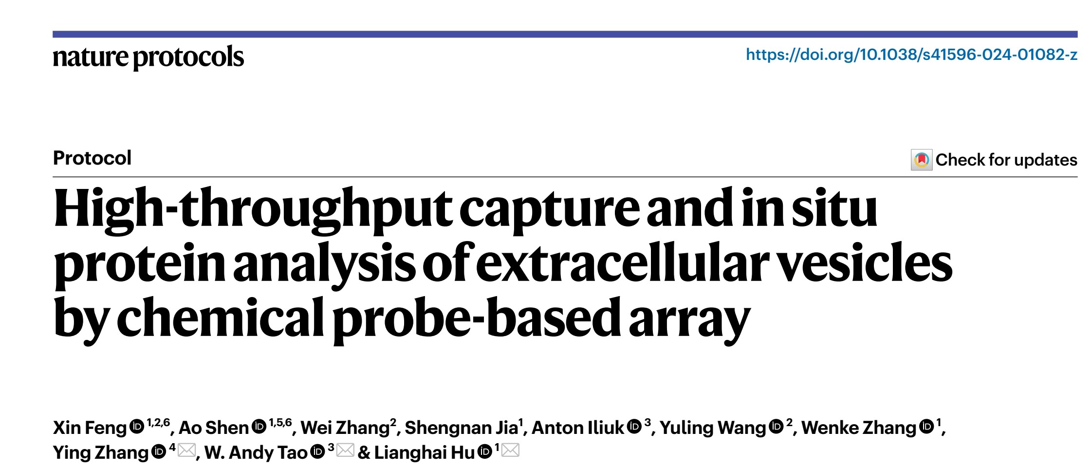 bv伟德国际1946胡良海教授联合美国普渡大学陶纬国教授和复旦大学张莹教授,开发了外泌体高通量捕获和原位蛋白质分析的一体化平台,以题为High-throughput capture and in situ protein analysis of extracellular vesicles by chemical probe-based array在线发表在Nature Protocols上。