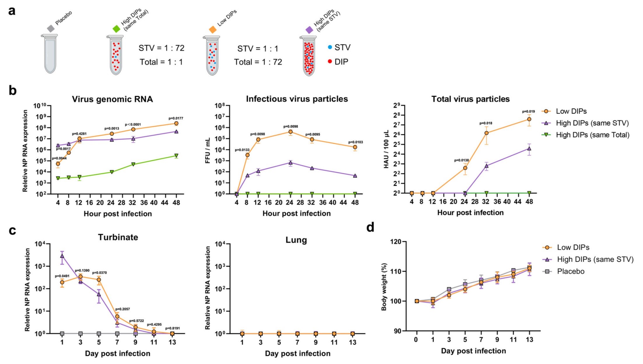 流感及其并发症每年导致全球数十万人死亡,而流感疫苗的保护性仍有待提高。市售的流感减毒活疫苗(LAIVs)是一种鼻喷接种的黏膜疫苗,其能够诱导黏膜免疫与系统性免疫,从机制上有望实现“防感染”。然而,现有商业化LAIVs在生产时常伴随高比例的缺损干扰颗粒(DIPs)产生,DIPs干扰标准病毒的复制,可能限制这种需要在呼吸道复制来产生免疫保护的LAIVs效力的“上限”。