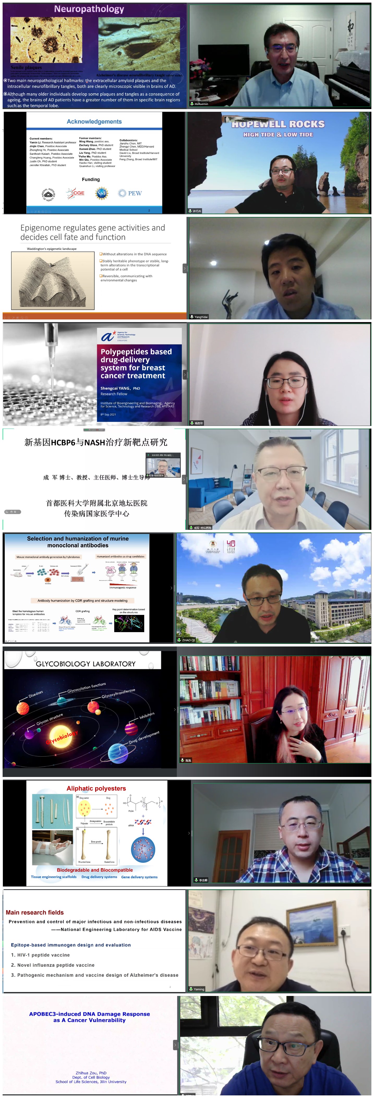 来自德克萨斯大学帕米亚盆地分校徐学敏教授、塔夫斯大学许巧兵教授、渥太华大学杨亦代副研究员、新加坡科技研究局杨胜彩研究员、澳门大学赵琦副教授、首都医科大学附属北京地坛医院成军教授、bv伟德国际1946官网李全顺教授、高印教授、单亚明教授、邹志华教授等做了精彩的学术报告。报告围绕生命科学前沿进展主题,内容包括“阿尔茨海默病和淀粉样蛋白假说”、“合成脂质体在核酸递送和基因编辑中的应用”、“COMPASS复合物结构和功能的研究”、“基于聚氨基酸材料的药物递送系统用于乳腺癌治疗”、“新基因HCBP6与NASH治疗新靶点的研究”、“靶向免疫检查点B7-H3的抗体免疫治疗的研究”、“癌症中的糖基转移酶及其生物作用”、“酶促合成生物医用高分子材料研究”、“基于流感HA的广谱表位疫苗研究”、“APOBEC3诱导的DNA损伤反应作为癌的软肋”。公司师生积极参与,现场气氛热烈,学术交流氛围浓厚。