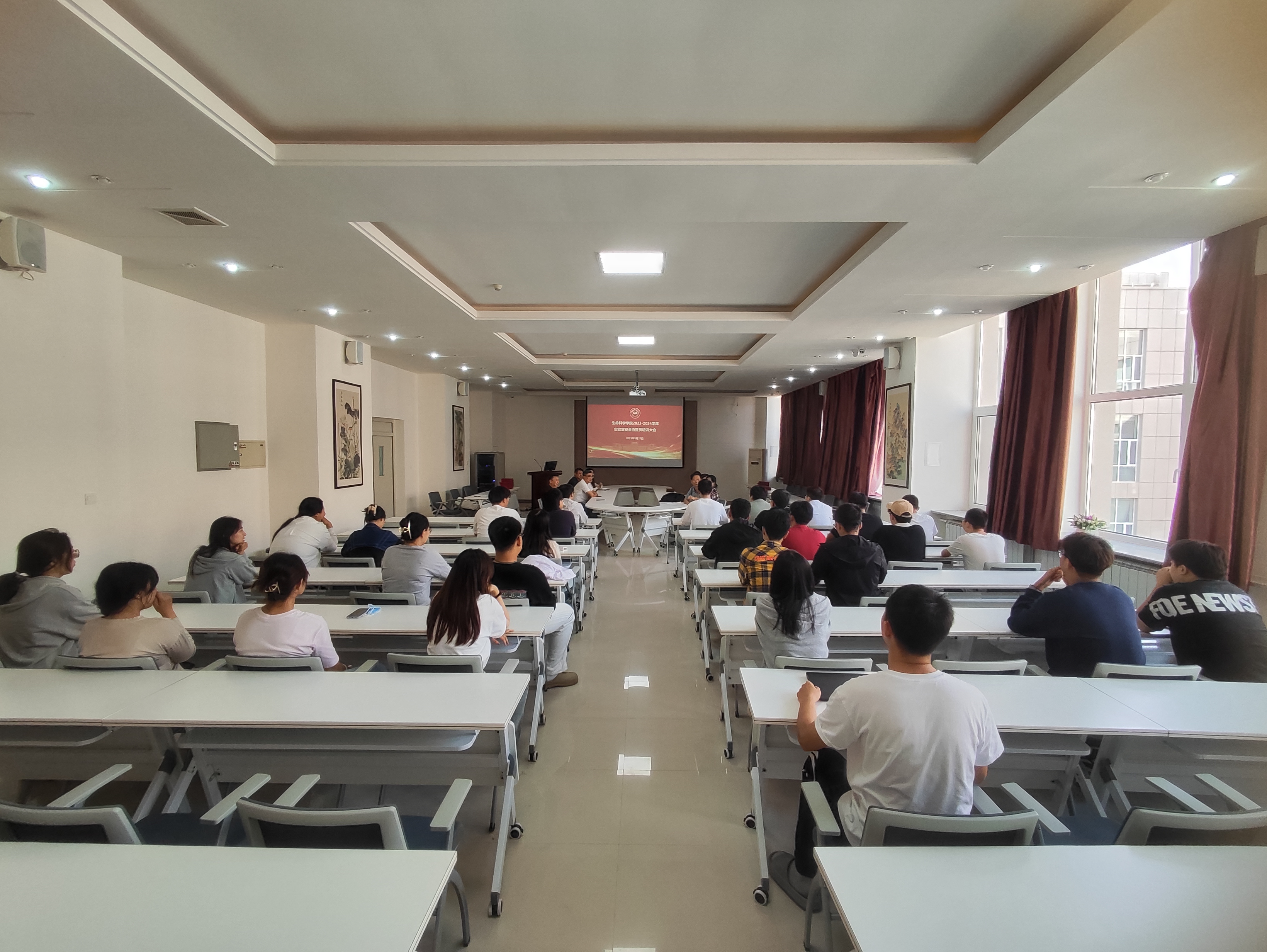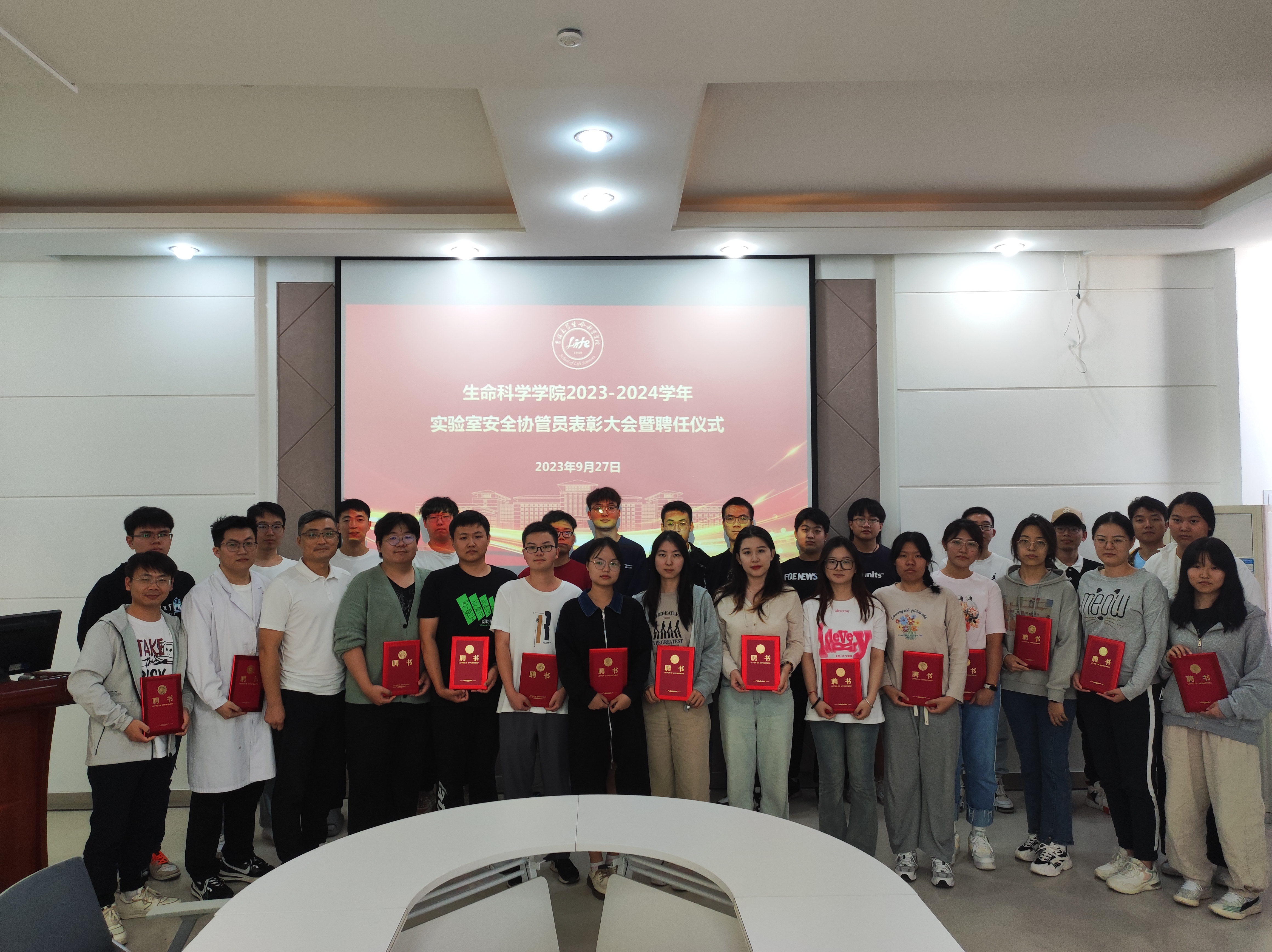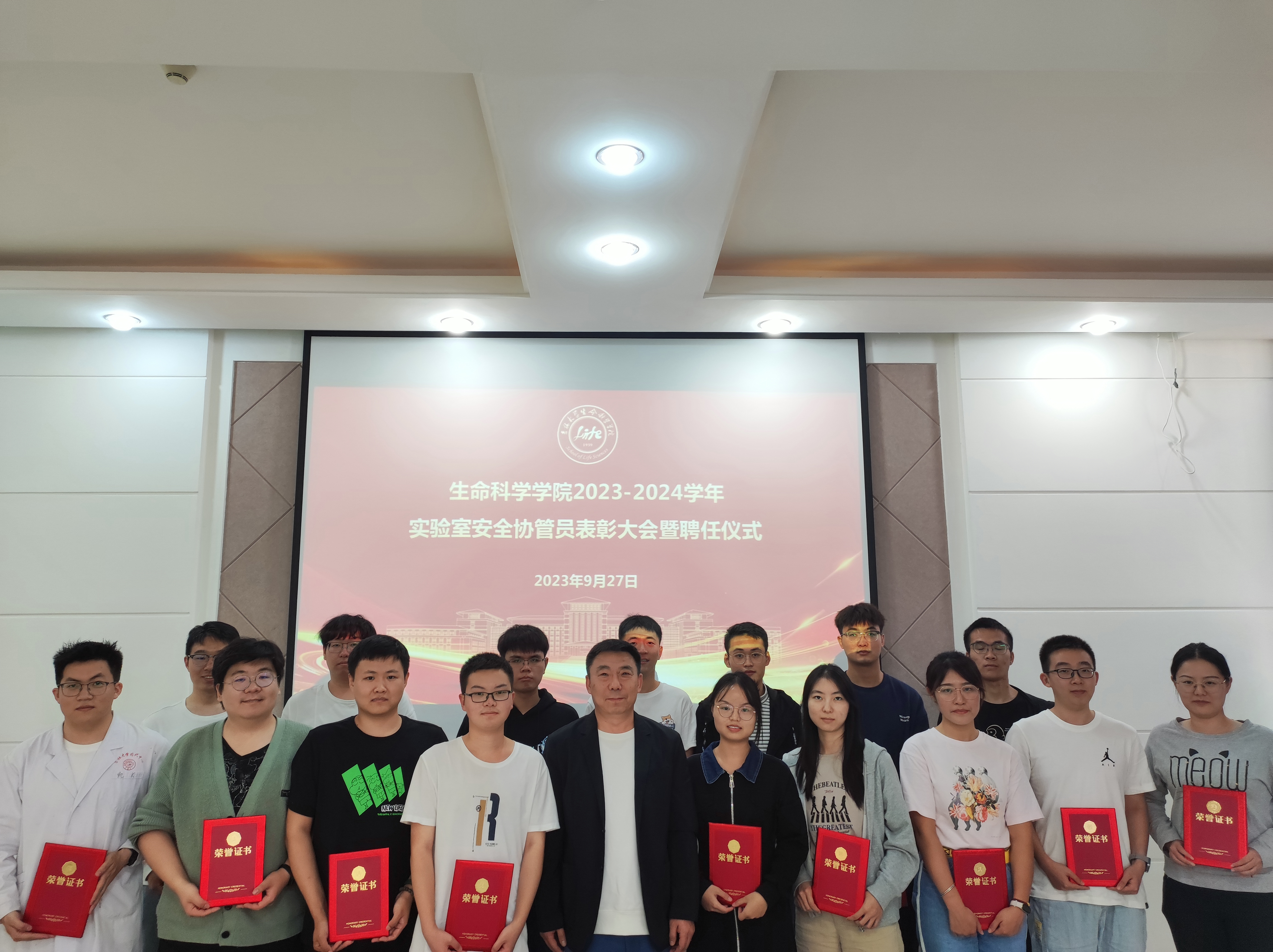 林相友为30名获得2022-2023学年“优秀实验室安全协管员”同学颁发荣誉证书;崔帅为34名2023-2024学年新聘实验室安全协管员同学颁发聘书,并与同学们合影留念。