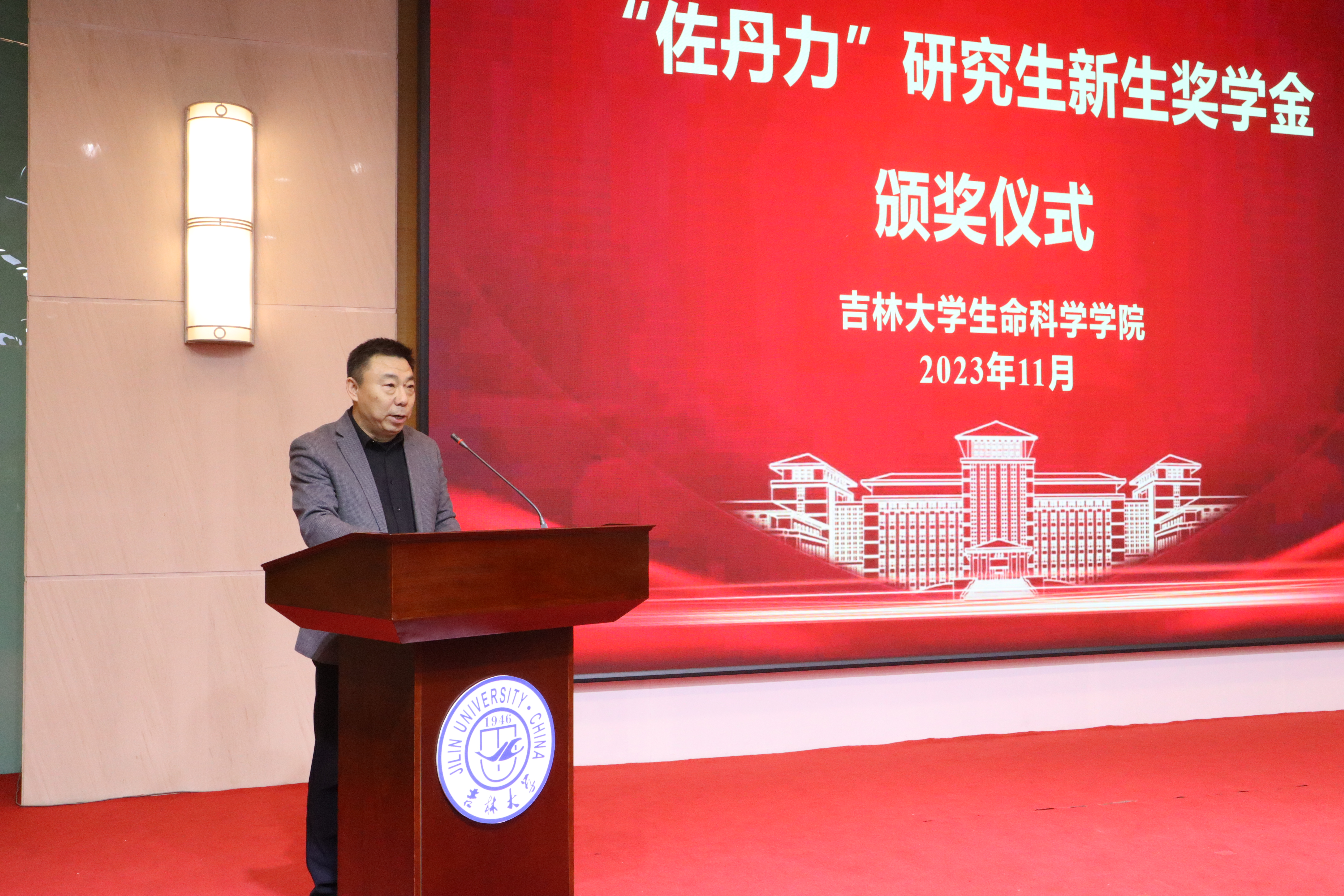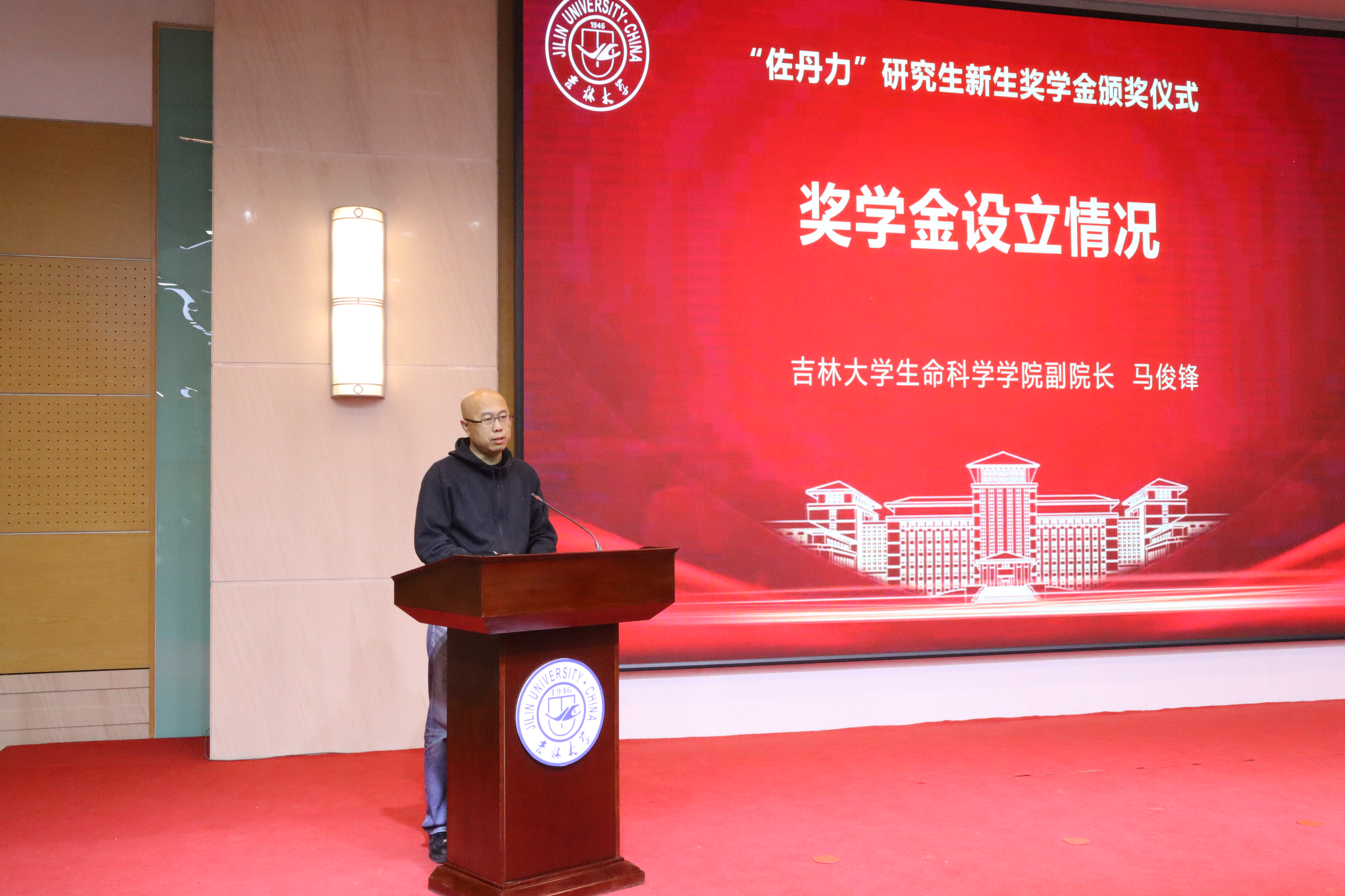 马俊锋介绍“佐丹力”研究生新生奖学金设立情况,本次奖学金共计发放78万元,旨在让获奖新生持续迸发科研热情,努力成为建设伟大祖国、建设美丽家乡的有用之才、栋梁之才;感谢韩丹员工对公司的贡献和支持,公司将聚焦主责主业,以更加饱满的热情投入一流人才培养事业,以更加务实的作风答好“一流学科”建设的生科答卷。