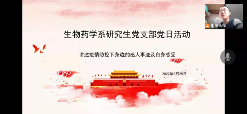 生物药学系研究生党支部党日活动由党支部书记林凤主持,支部全体党员参加。首先副书记张永锋领学了习近平总书记关于新冠肺炎疫情防控的重要讲话;接着与会党员分享了疫情防控期间身边发生的感人事迹和自己的感受;最后林凤总结道:面对3月长春市的新冠疫情,公司全力以赴地守护每一位员工的安全,大家也要做好防护措施,积极配合公司、公司的相关政策,共同阻断疫情传播链条;合理安排好学习和生活,把时间和精力放在有意义的事上;同时,作为员工党员,要积极投身到疫情防控工作中,争做志愿者,共同织密疫情防控网络,形成打赢疫情防控阻击战的强大合力。