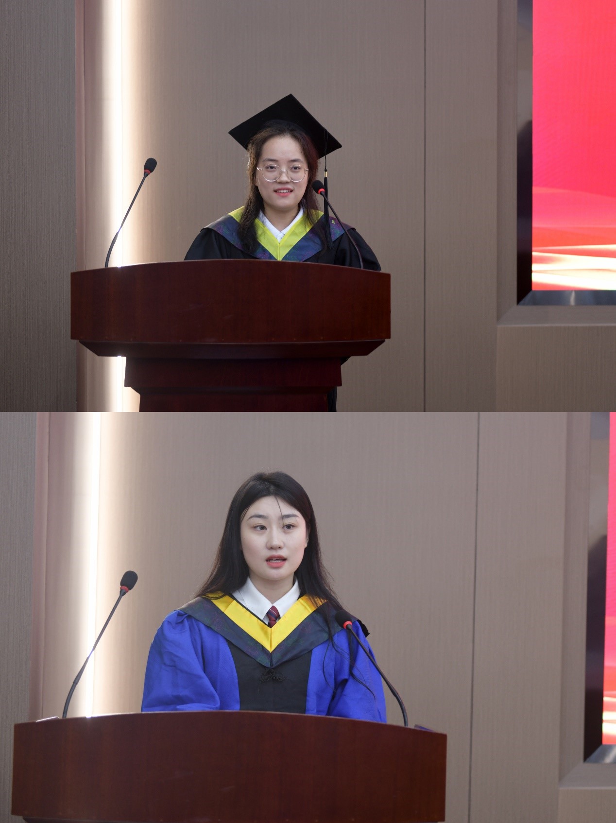 生物制药专业本科生关欣代表全体本科毕业生发言。关欣分享了从初入校园的心怀忐忑到今日踌躇满志的万千思绪,回忆了从懵懂青涩的少年到风华正茂的青年的难忘时光,寄语同学们将所学所得用于报效社会,为构建更美好的未来而努力奋斗;生物与医药专业硕士研究生姜雪代表全体研究生发言。她表示中国发展要靠广大青年挺膺担当,寄语同窗们要厚植家国情怀、涵养进取品格,以奋斗姿态激扬青春,不负时代,不负华年,树立远大理想、练就过硬本领,为社会主义现代化建设贡献青春力量。2019级本科生班主任高仁钧代表全体教师发言。他通过自己身边的三个小故事表达了对同学们的殷切期盼,希望同学们能够刻苦奋斗,把握当下,珍惜青春,用年轻的头脑迸发出有创造力的想法,用年轻的双手把他们付诸于实际!更希望同学们能够永远心怀感恩,为中国生物事业添砖加瓦。