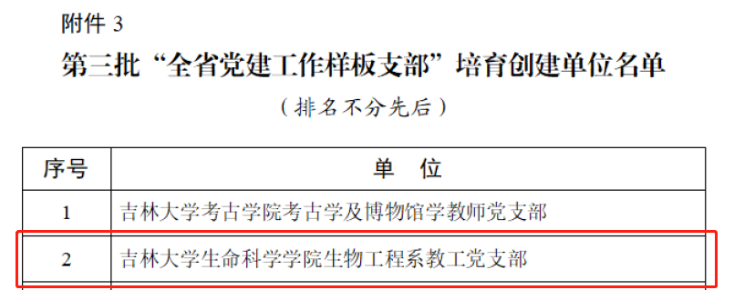 近日,中共吉林省委教育工作委员会正式公布第三批新时代全省党建工作示范高校、标杆院系、样板支部培育创建单位名单。bv伟德国际1946官网生物工程系教工党支部入选第三批“全省党建工作样板支部”培育创建单位。
