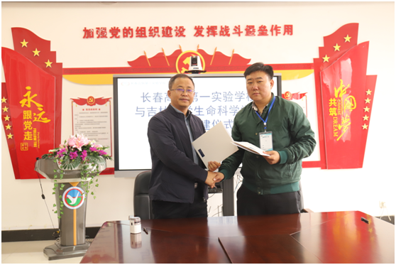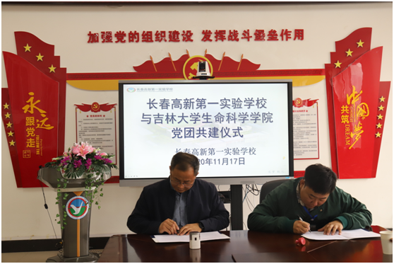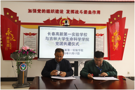 2020年11月17日上午9点,bv伟德国际1946官网与长春高新第一实验公司党团共建交流暨老员工志愿服务基地签约仪式在高新第一实验公司会议室举行。参加签约仪式的有长春高新第一实验公司董事长兼党支部书记张安辉、党支部副书记李兰君、党政办公室主任魏盛楠,bv伟德国际1946官网团委书记丁子芮、辅导员齐鹏、刘春天,员工代表杨意。