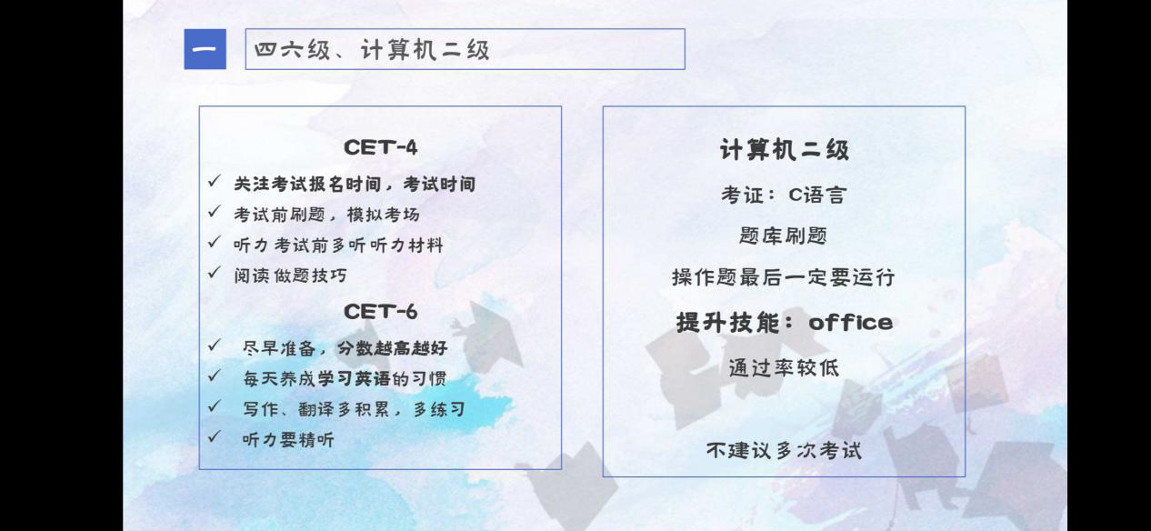 张祎宁学姐不仅为我们分享了微生物学、遗传学等课程的学习方法,还重点分享了如何备考计算机二级和英语四六级。同时为我们讲解了大创的流程和她的大创经验。