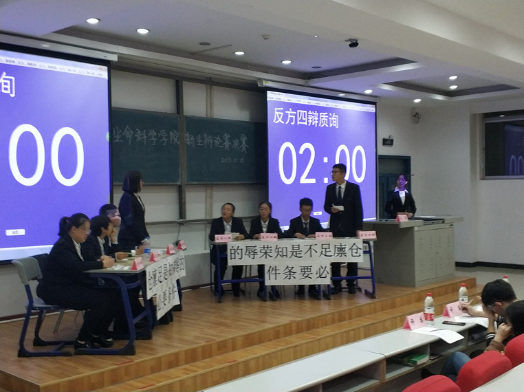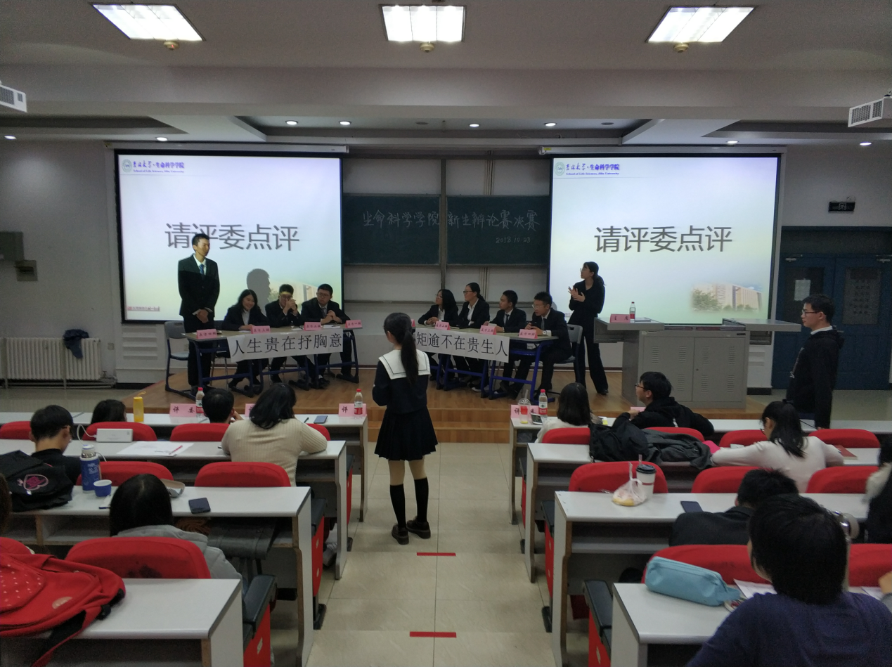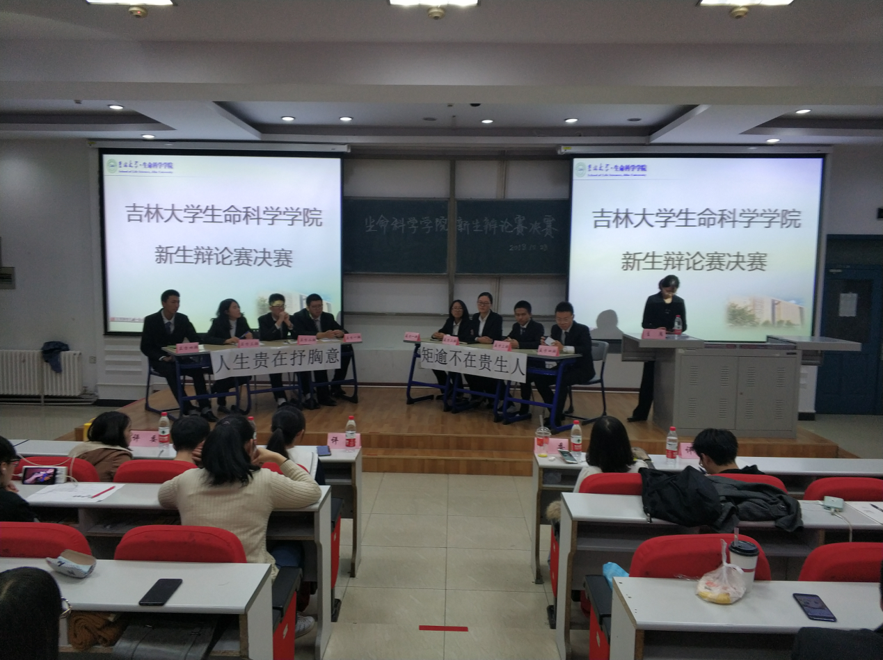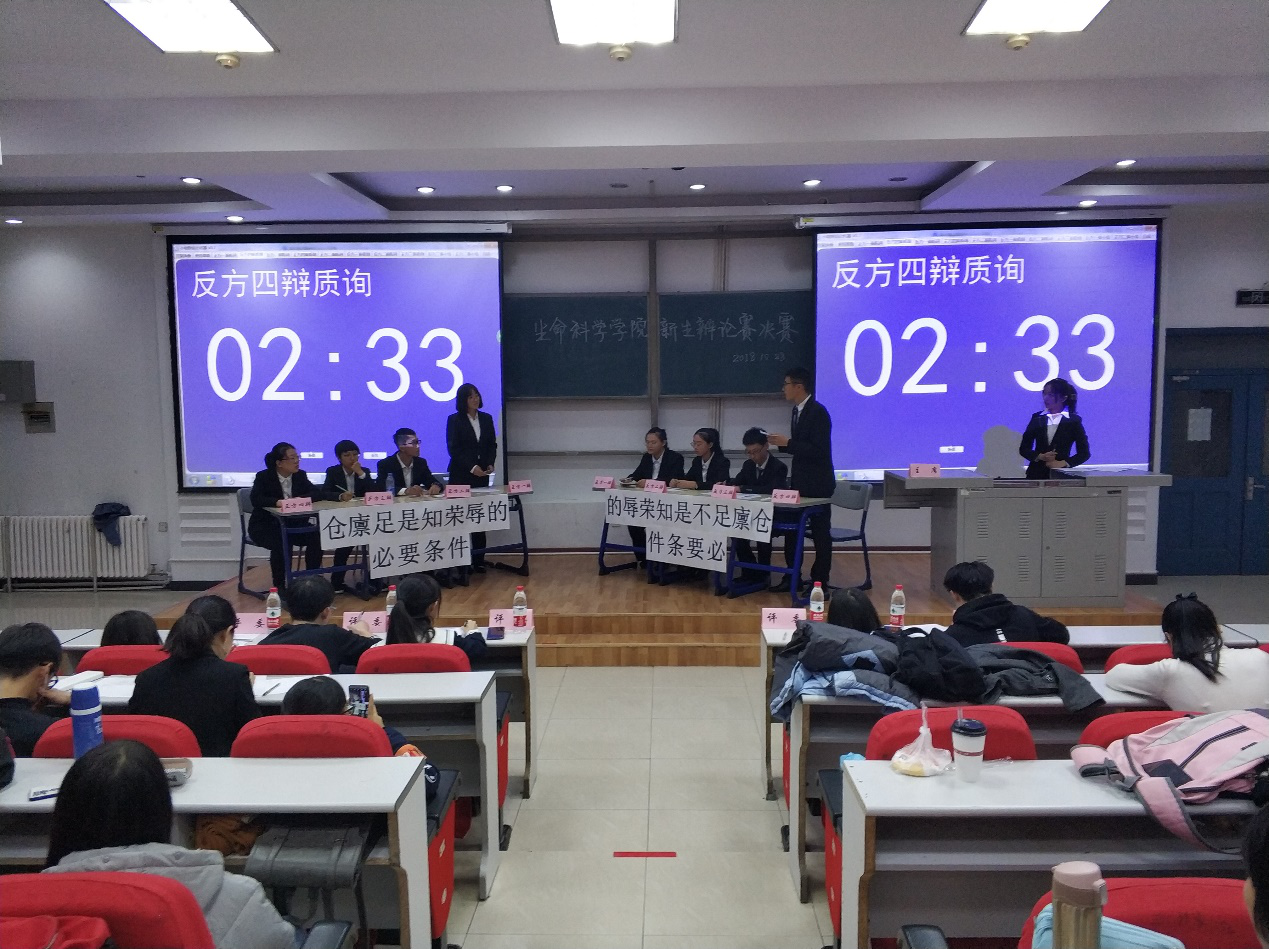 为锻炼员工的思维逻辑和语言表达能力,培养团队协作能力,形成勤于思考、敢于思辨、善于思辨、积极探索的良好氛围,生命科学学院开展了为期一个月的新生杯辩论赛。10月28号晚上六点,辩论赛决赛在经信教学楼第三阶梯教室举行。进入决赛的班级有2018级八班,2018级二班,2018级三班和2018级四班。决赛由2015级张诗音、黄振轩,2016级刘乃彰、董泳辰、李鑫担任评委。