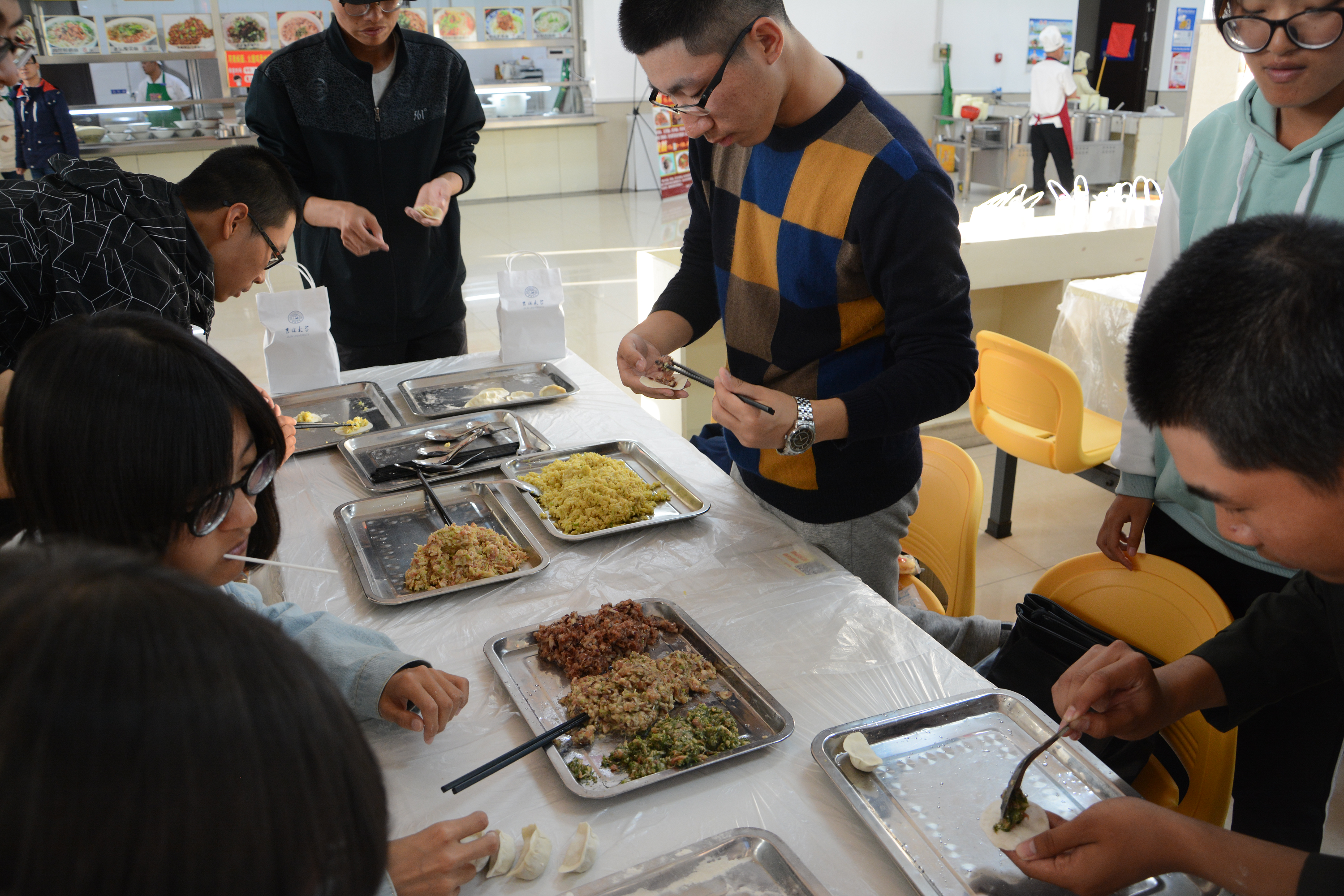而在另一边,湖畔餐厅的一楼,勤工助学部责带领同学们兴致勃勃的包着饺子。在后厨,大一热心的同学们,帮忙擀皮、和馅,忙的不亦乐乎。新生们表示虽然包饺子的过程不容易,但看到热气腾腾的饺子出锅时却感到异常的满足。和同窗好友、师兄师姐一起品尝自己亲手包的饺子,大家欢声笑语、谈笑风生,享受着别样的团圆。