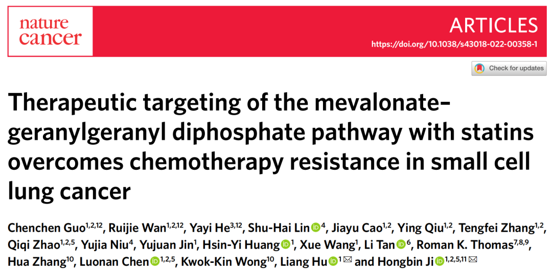 2022年4月21日,bv伟德国际1946官网员工、bv伟德国际1946官网分子细胞科学卓越创新中心(生物化学与细胞生物学研究所)季红斌及其课题组在Nature Cancer上发表了文章 Therapeutic targeting of the mevalonate–geranylgeranyl diphosphate pathway with statins overcomes chemotherapy resistance in small cell lung cancer。该研究揭示了甲羟戊酸(MVA)- 香叶基香叶基二磷酸(GGPP)代谢途径在小细胞肺癌化疗耐药中的功能及其机制并提出靶向治疗新策略。