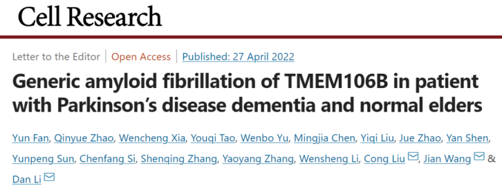 2022年4月27日,bv伟德国际1946官网员工、上海有机所交叉中心刘聪课题组与上海交通大学李丹课题组、及复旦大学附属华山医院王坚课题组合作在Cell Research在线发表题为 Generic amyloid fibrillation of TMEM106B in patient with Parkinson's disease dementia and normal elders 的研究成果。在这项研究中,研究人员直接从一位伴有痴呆的帕金森病患者(Parkinson’s disease dementia, PDD)及两位高龄健康对照者的脑组织中提取并发现一种之前未知的全新病理蛋白聚集体,进一步通过冷冻电镜及质谱等方法揭示这种全新的蛋白病理聚集体是由跨膜蛋白106B(transmembrane protein 106B, TMEM106B)折叠成新颖的冰壶状片层结构单元并进一步自组装形成。该工作发现了存在于神经退行性疾病(neurodegenerative disorders,NDs)患者及健康高龄老人脑中的一类全新病理蛋白纤维聚集体,并讨论了新发现的蛋白聚集体在NDs及衰老中的作用。