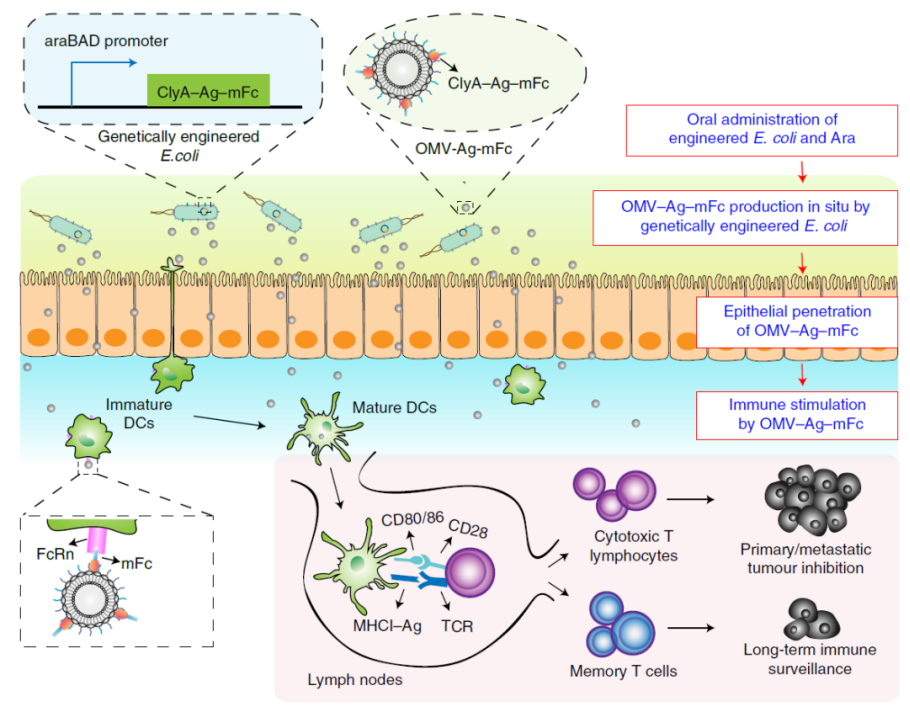 小鼠模型实验显示,这些 OMV-Ag-mFc能够有效地穿过肠上皮屏障并被肠道固有层中的树突状细胞(DC)摄取,然后产生引流淋巴结和肿瘤抗原呈递。肿瘤抗原特异性免疫激活,并在多种小鼠癌症模型中发挥抗肿瘤作用,显著抑制肿瘤生长。