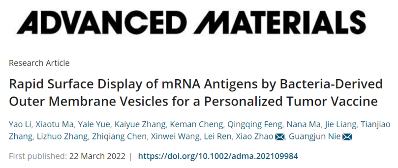 2022年3月,聂广军团队和赵潇团队在Advanced Materials期刊发表论文【3】,使用OMV作为 mRNA 递送平台,通过基因工程对其进行RNA 结合蛋白L7Ae和溶酶体逃逸蛋白李斯特菌溶血素O的表面修饰——OMV-LL。OMV-LL 可以通过 L7Ae 结合 mRNA 抗原并将它们递送到树突状细胞中,然后通过李斯特菌溶血素O 介导的内体逃逸进行交叉呈递。