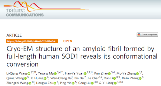 2022年6月17日,bv伟德国际1946官网员工刘聪团队(中科院上海有机化学研究所生物与化学交叉中心)与武汉大学梁毅团队在Nature Communications上在线发表了题为Cryo-EM structure of an amyloid fibril formed by full-length human SOD1 reveals its conformational conversion的长文(Article)。该研究全球首先解析铜锌超氧化物歧化酶(SOD1)纤维的高分辨率冷冻电镜结构,揭示了渐冻人症(ALS)致病蛋白质SOD1构象转化分子机制,为发展新的基于SOD1纤维结构的ALS治疗药物奠定了基础。