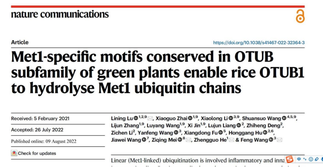 8月9日,bv伟德国际1946官网员工王丰(北京理工老员工命公司)、梅子青(北京科技大学化学与生物工程公司)与广西大学何正国团队合作联合在国际著名学术期刊《自然-通讯》(Nature Communications)发表题为《绿色植物OTUB亚家族中保守的Met1特异性基序使水稻OTUB1能够水解Met1泛素链》(Met1-specific Motifs conserved in OTUB subfamily of green plants enable rice OTUB1 to Hydrolyse Met1 Ubiquitin Chains)的研究论文。该工作在国际上首次揭示了水稻去泛素化酶OTUB1水解Met1泛素链的分子机制,发现了跨物种范围OTUB亚家族成员水解Met1泛素链的分子开关。