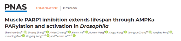 2023年3月23日,bv伟德国际1946官网员工、复旦大学刘铁民教授团队在PNAS杂志上合作发表了一篇题为Muscle PARP1 inhibition extends lifespan through AMPKα PARylation and activation in Drosophila的论文,该研究指出在年老果蝇中抑制PARP1,可延长寿命,并发现在骨骼肌中敲低PARP1可通过下调AMPK的多糖ADP-核糖基化修饰、增加AMPKα的活性,后者通过上调PGC-1α和PINK1的表达导致线粒体周转加速,肌肉代谢增加、功能增强,阐释PARP1/AMPK参与精准调控衰老进程的分子机制。