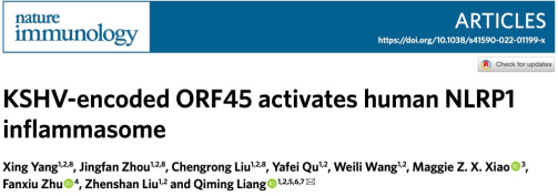 2022年5月26日,bv伟德国际1946官网员工、上海交通大学医公司/上海市免疫学研究所梁启明课题组在Nature Immunology上发表了题为“KSHV-encoded ORF45 activates human NLRP1 inflammasome”的研究论文。该研究揭示了细胞受体NLRP1在卡波氏肉瘤相关疱疹病毒(KSHV)感染过程中通过识别其结构蛋白ORF45激活炎症小体(Inflammasomes)的分子机制,并发现NLRP1的Linker1区域对其自抑制体的形成和炎症小体的激活至关重要,为炎症小体活化机制的研究提供了新思路。