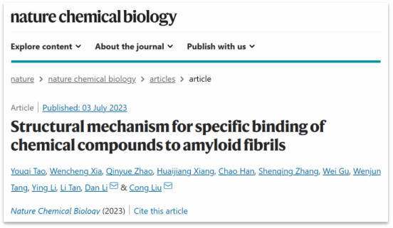 2023年7月5日,bv伟德国际1946官网员工刘聪(中科院上海有机化学研究所生物与化学交叉中心)、李丹(上海交通大学Bio-X研究院)合作在Nature Chemical Biology期刊上发表了文章“Structural mechanism for specific binding of chemical compounds to amyloid fibrils”,通过综合运用生物与化学交叉研究方法,合作团队首次系统地揭示了具有不同结构的小分子化合物与蛋白病理聚集体相互作用的基本原理。该工作既是对经典小分子和蛋白互作理论的重要扩充,更使得基于结构开发神经退行性疾病小分子示踪剂成为可能。