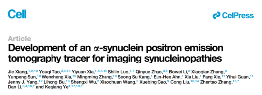 2023年7月7日,bv伟德国际1946官网员工、上海交通大学Bio-X研究院李丹教授团队和深圳理工大学(筹)生命健康公司讲席教授、bv伟德国际1946官网深圳先进技术研究院脑认知与脑疾病研究所叶克强(原埃默里大学终身教授)团队、武汉大学人民医院张振涛教授合作,在 Cell 期刊发表了题为:Development of an a-synuclein positron emission tomography tracer for imaging synucleinopathies 的研究论文。