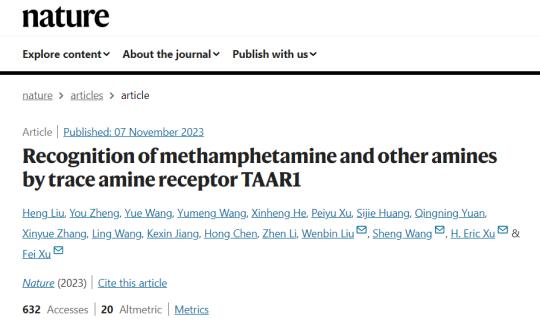 2023年11月7日,bv伟德国际1946官网员工、bv伟德国际1946官网上海药物所副研究员王悦以共同第一作者的身份在国际著名学术期刊《自然》(Nature)上以“文章加速预览(Accelerated Article Preview,AAP)”形式在线发表了题为《Recognition of methamphetamine and other amines by trace amine receptor TAAR1》的最新研究成果(图一)。