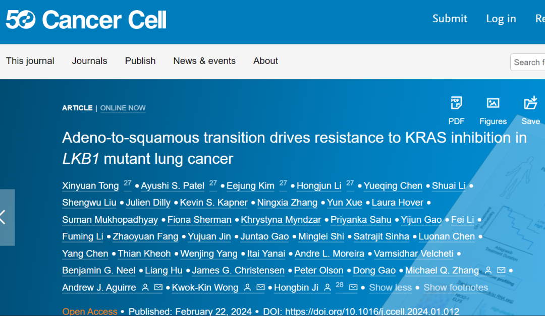 近日,bv伟德国际1946官网杰出员工、bv伟德国际1946官网分子细胞科学卓越创新中心季红斌研究员联合纽约大学医公司Kwok-Kin Wong团队,哈佛医公司丹娜法伯癌症研究所Andrew J. Aguirre团队以及清华大学张奇伟团队在Cancer Cell上发表文章 Adeno-to-squamous transition drives resistance to KRAS inhibition in LKB1-mutant lung cancer。该研究发现肺腺鳞癌转分化驱动KRAS靶向治疗耐药的产生,在深入解析其分子机制的基础上,鉴定KRT6A可以作为生物学标志物有效预测患者对KRAS靶向治疗的响应。