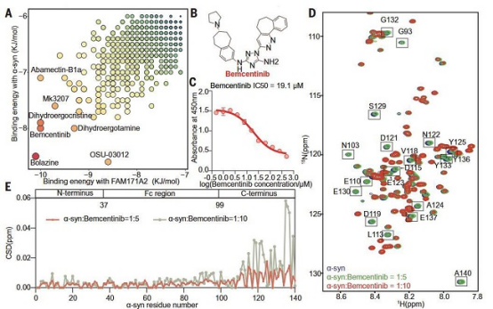 进一步地,通过在小鼠模型中过表达或敲低FAM171A2蛋白,结合体外细胞实验,研究团队揭示了FAM171A2介导神经元对PD病理蛋白α-syn淀粉样纤维的摄取和传播的致病机制,从而导致神经毒性并加重PD病理进展。特别地,通过体外研究发现FAM171A2通过胞外结构域1与α-syn淀粉样纤维的羧基末端区域通过静电力相互作用直接结合,且FAM171A2与α-syn淀粉样纤维具有与α-syn单体相比更高的结合亲和力。最后,研究人员基于已有的相互作用结构模型,通过人工智能的蛋白结构预测和高通量虚拟筛选技术,得到抑制FAM171A2与α-syn淀粉样纤维结合的小分子抑制剂bemcentinib,该小分子抑制剂在体外细胞模型中可有效抑制多巴胺能神经元对α-syn淀粉样纤维的摄取。