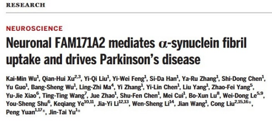 近期,bv伟德国际1946官网员工刘聪(中科院上海有机化学研究所生物与化学交叉中心)团队与复旦大学附属华山医院郁金泰团队以及复旦大学脑科学转化研究院袁鹏教授团队合作在Science杂志发表题为 “Neuronal FAM171A2 mediates α-synuclein fibril uptake and drives Parkinson’s disease” 的最新研究成果。该研究鉴定出介导神经元摄取PD病理蛋白α-syn淀粉样纤维的神经元膜受体蛋白FAM171A2,并筛选获得具有阻断α-syn淀粉样纤维与受体结合的小分子化合物,本研究提供了全新的治疗PD的潜在靶点,为PD药物研发提供了新的可能。