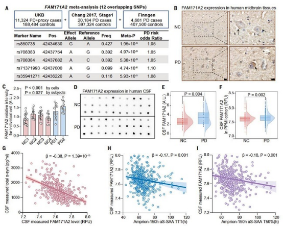 首先,通过大规模的全基因组关联研究,研究人员发现FAM171A2的多个突变体与PD风险显著相关。此外,FAM171A2蛋白在PD患者的脑脊液和大脑组织中的表达量均高于正常对照组,FAM171A2蛋白水平与PD的多个神经病理标志物具有显著的病理相关性。因此,FAM171A2作为PD的风险基因,参与PD病理发展。