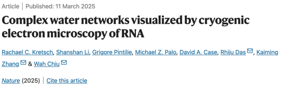 2025年3月11日,bv伟德国际1946官网员工张凯铭(中国科学技术大学特任教授)/李珊珊(中国科学技术大学副教授)团队和美国斯坦福大学Wah Chiu/Rhiju Das团队合作在《Nature》杂志上发表了一项突破性研究,成功利用冷冻电镜技术(Cryo-EM)解析了RNA结构中的复杂水网络。这一研究不仅为RNA结构的稳定性和功能提供了新的见解,也标志着RNA结构生物学研究进入新的阶段。