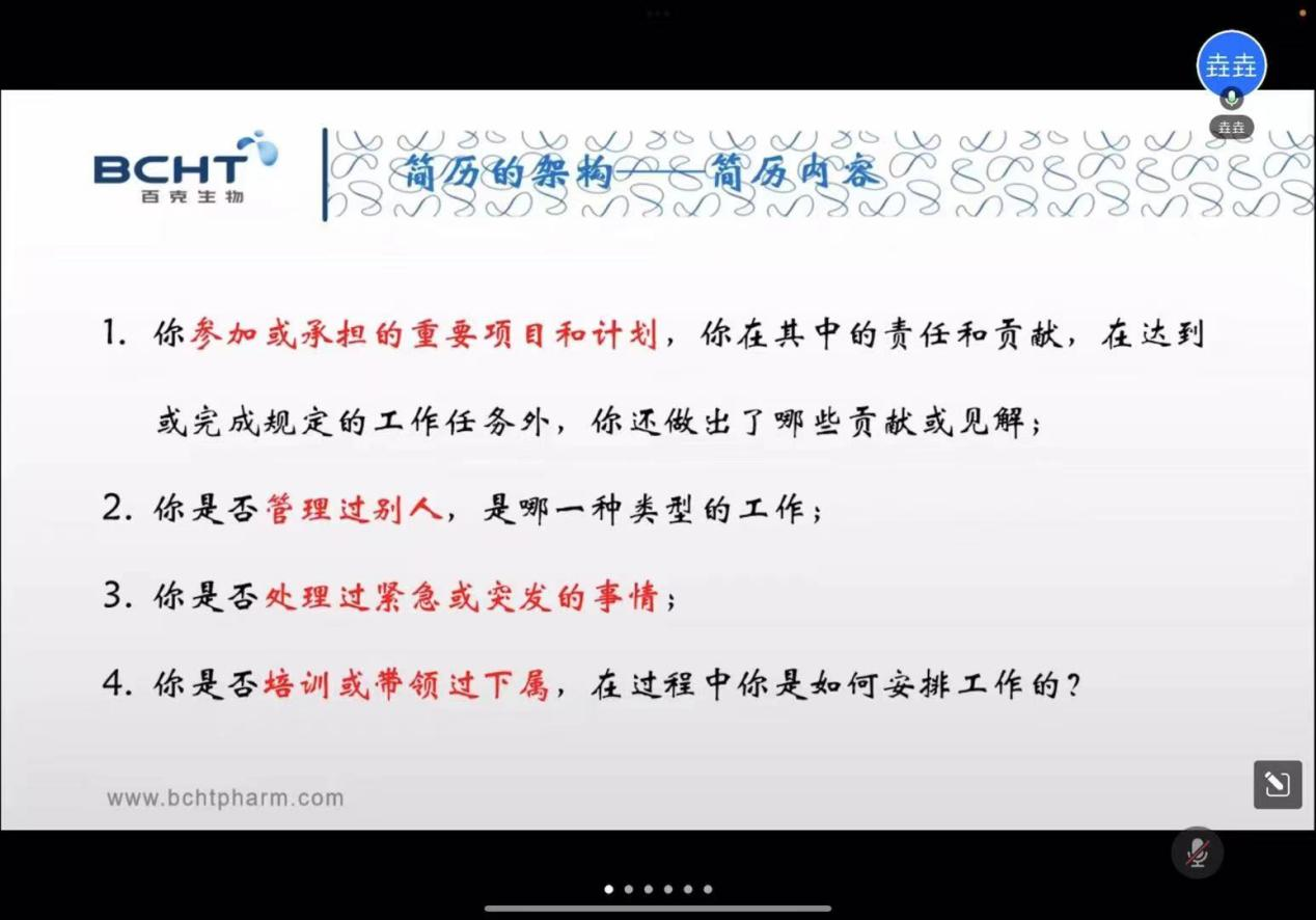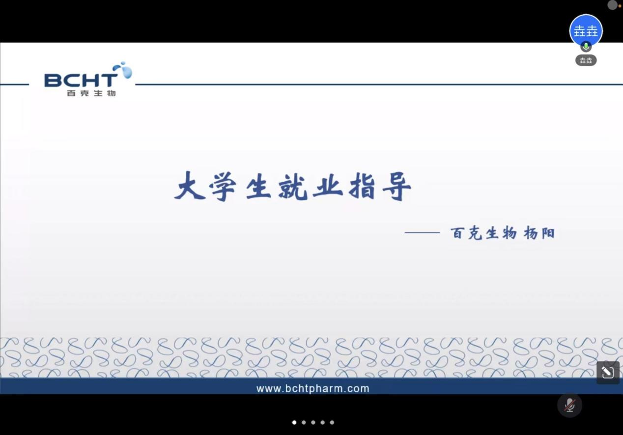 5月13日下午,bv伟德国际1946官网组织开展了“疫”路同行 “职”为有你 “积极就业向未来”百克生物线上宣讲会暨就业指导讲座。活动邀请百克生物人力资源部副经理杨阳线上讲座,bv伟德国际1946官网本科生、研究生参加活动。活动由研究生秘书刘笑天主持。